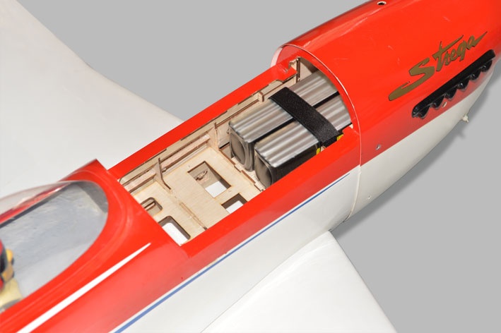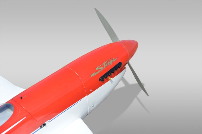Die Motorhaube ist aus GFK gefertigt und fertig lackiert. Die Strega ist komplett aus Holz hochwertig aufgebaut und mit Original Oracover Folie bespannt. Hervorzuheben ist das robuste und gefederte Einziehfahrwerk sowie die Funktion der Landeklappen. Mit den empfohlenen kraftvollen Motoren erreicht das Modell beeindruckende Flugleistung.