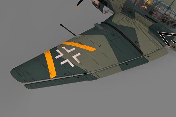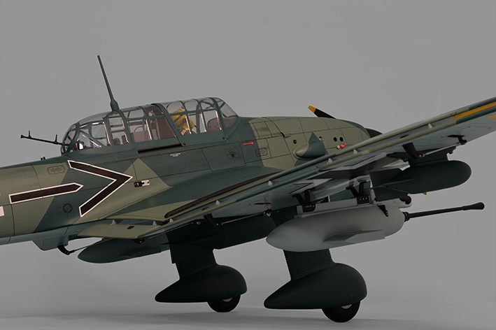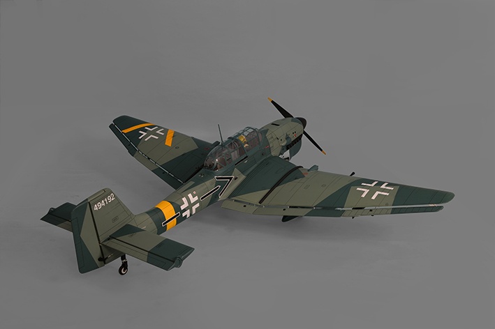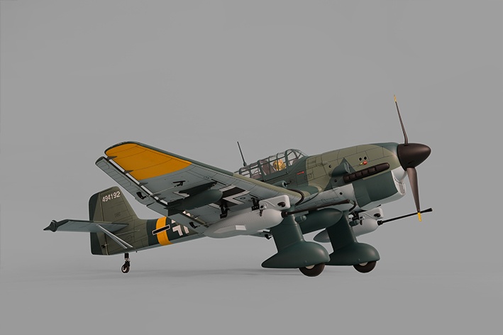Die Stuka Ju87 ist ein einmotoriges Sturzampfflugzeug (Stuka) das 1935 entwickelt wurde. Der zweisitzige Tiefdecker mit seinen markanten Knickflügeln und starrem Fahrwerk wurde für Bombenangriffe im Rahmen taktischer Einsätze als Sturzflugzeug eingesetzt.
