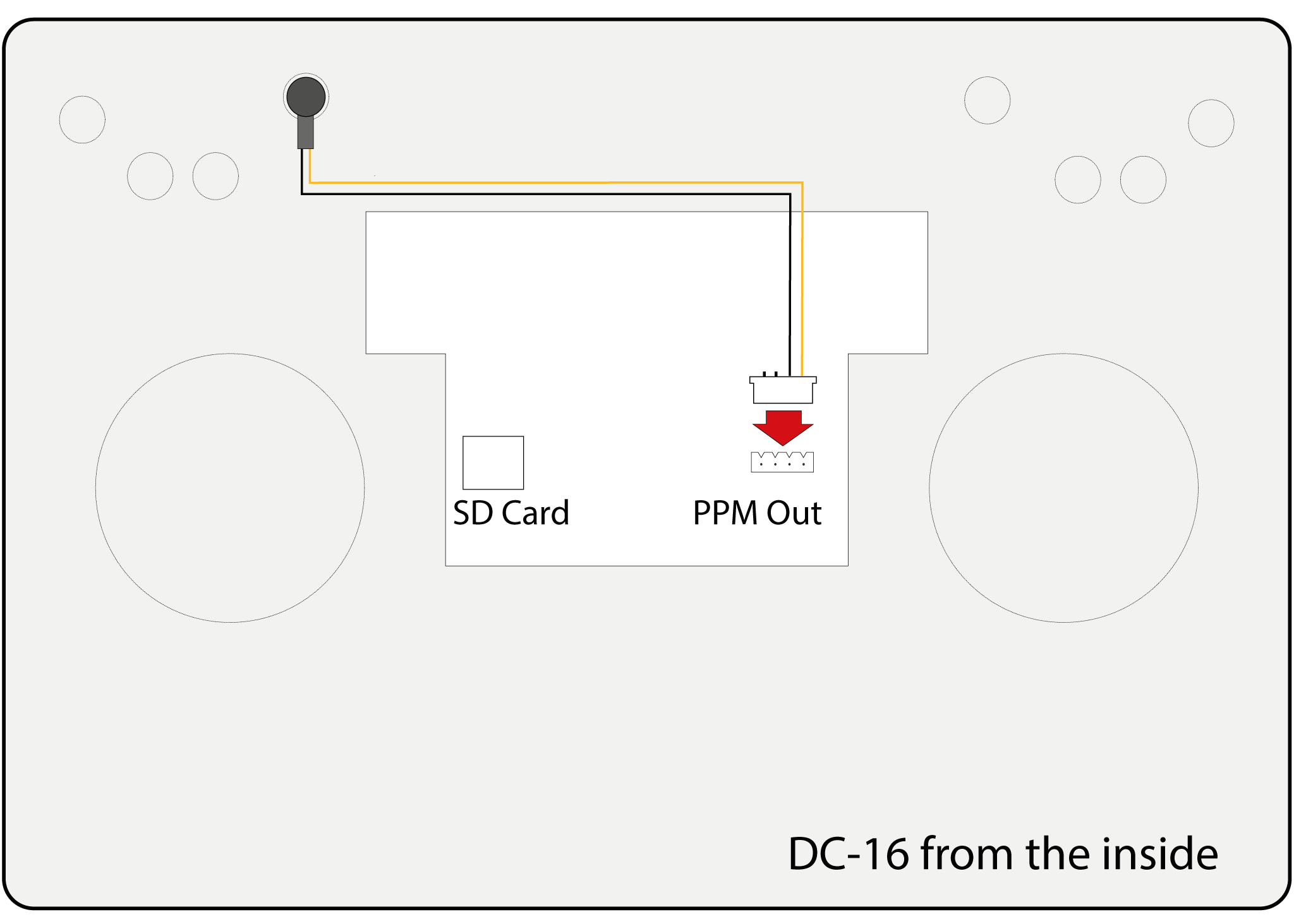 der Stecker gehört im Sender auf den Anschluss, markiert mit “PPM Out”, gesteckt.