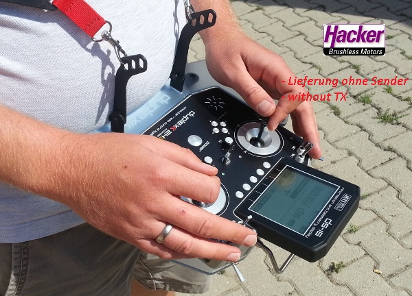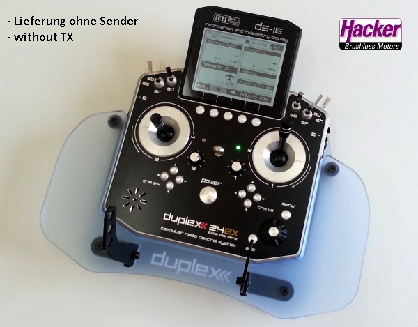 Der Sender kann einfach und schnell zwischen den Platten formschlüssig montiert werden, ein Herausfallen ist absolut ausgeschlossen. Das Senderpult schließt bündig und ohne Stufe mit der Senderoberfläche ab, die klappbaren Haltebügel für den Jeti-Kreuzgurt bzw den Jeti-Umhängeriemen sind integriert.