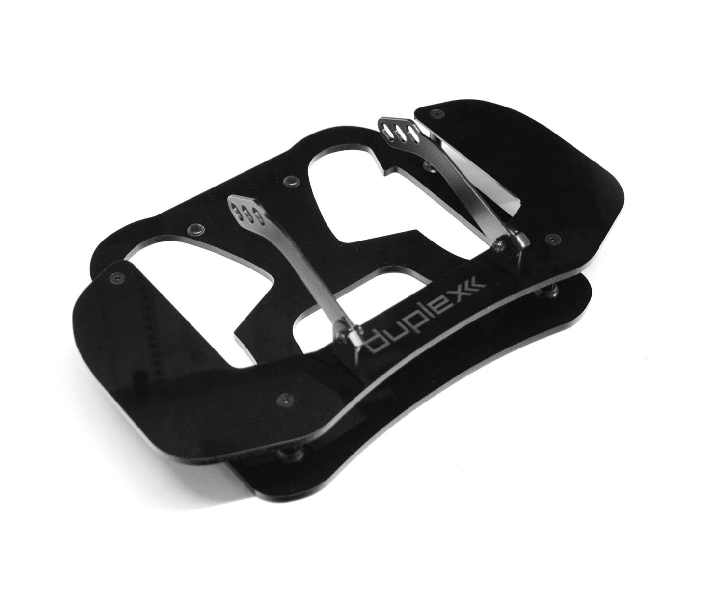 Der Sender kann einfach und schnell zwischen den Platten formschlüssig montiert werden, ein Herausfallen ist absolut ausgeschlossen. Das Senderpult schließt bündig und ohne Stufe mit der Senderoberfläche ab, die klappbaren Haltebügel für den Jeti-Kreuzgurt bzw den Jeti-Umhängeriemen sind integriert.
