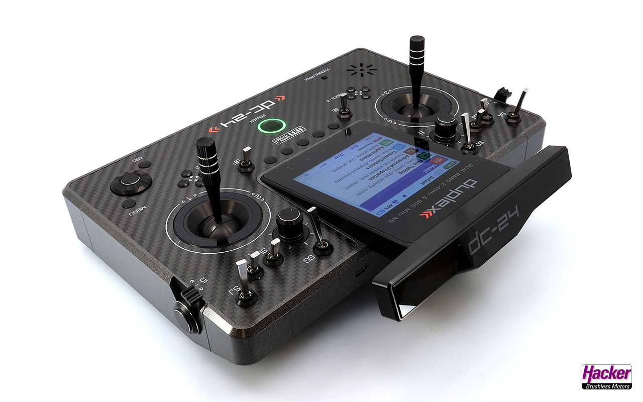 Pultsender DC-24 II – Carbon Line Gray Multimode (Auslieferzustand Mode 2, Steuermode sehr einfach wechselbar), Senderakku eingebaut, Ladegerät für Senderakku, stabiler Transportkoffer, Senderkreuzgurt