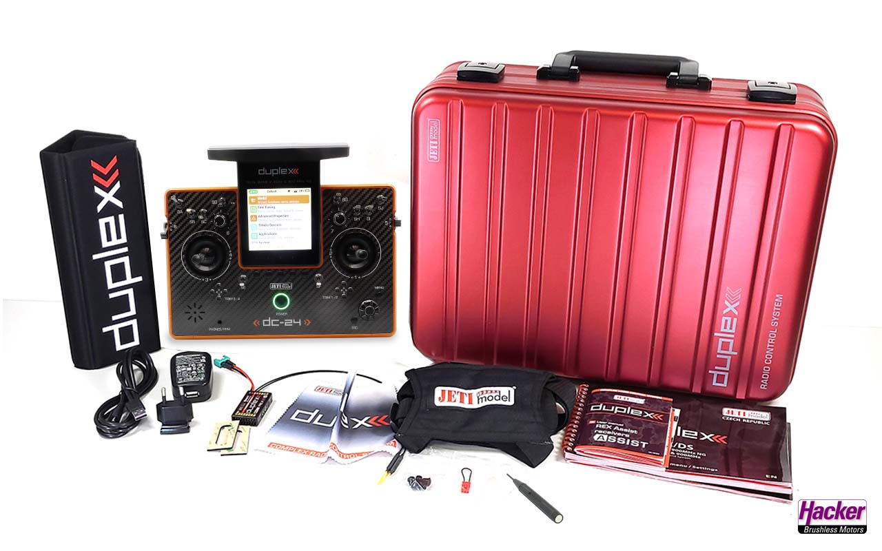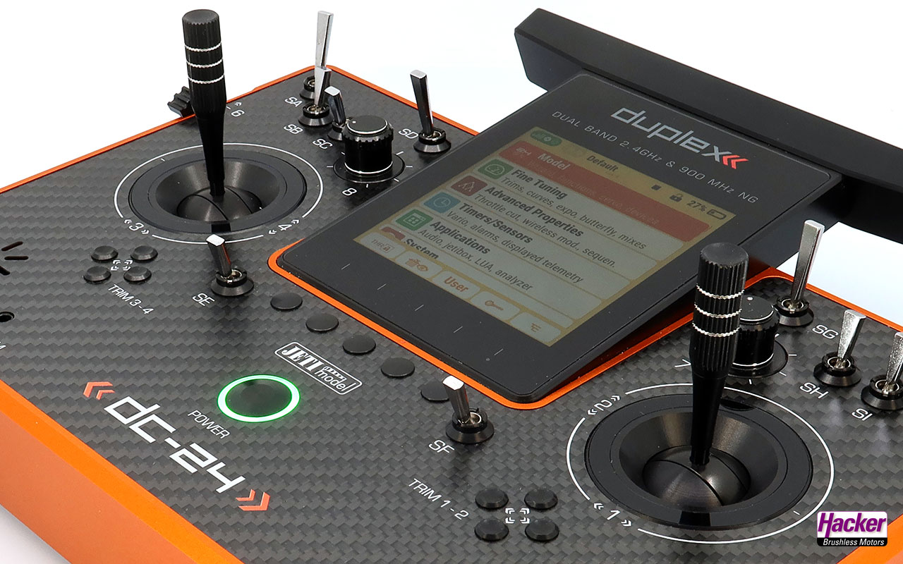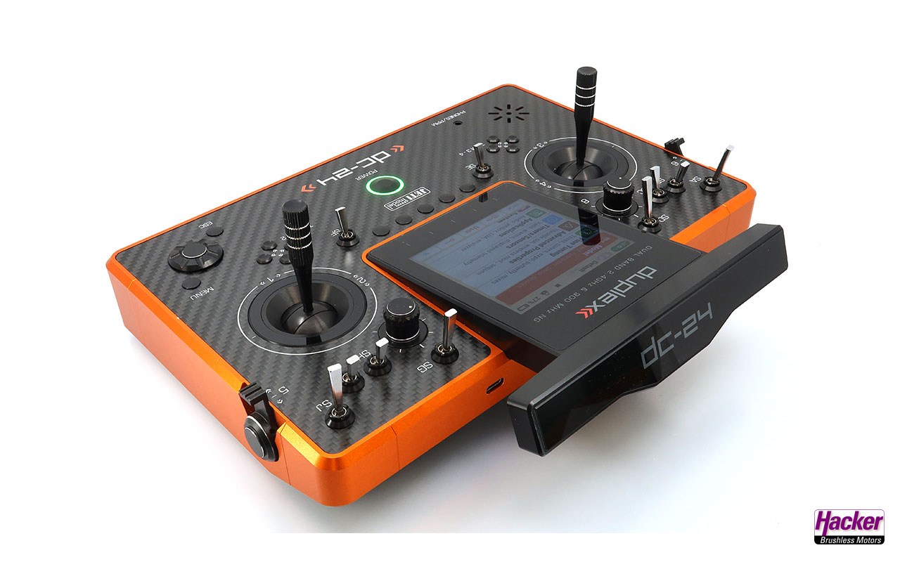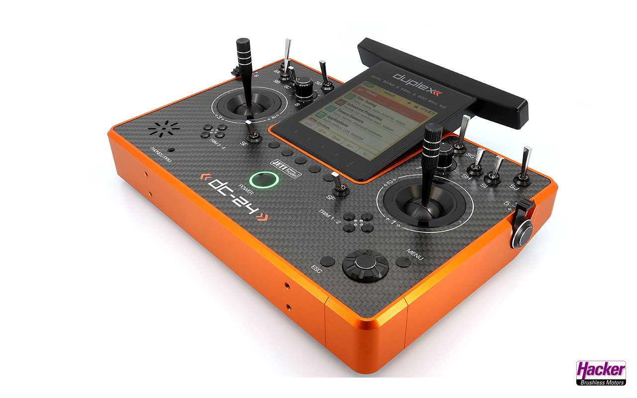 Sender DC-24 Dark Orange Carbon Line Multimode (Auslieferzustand Mode 2, Steuermode sehr einfach wechselbar), Senderakku eingebaut, Ladegerät für Senderakku, stabiler Transportkoffer, Senderkreuzgurt