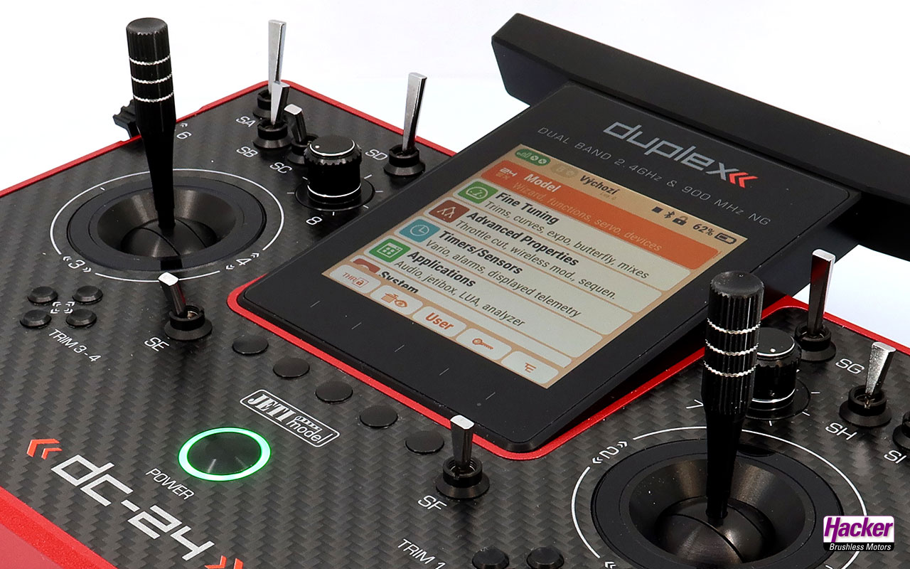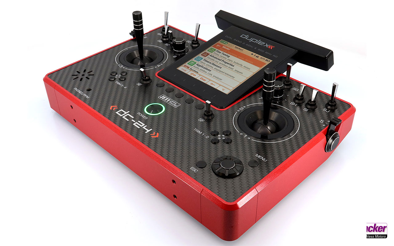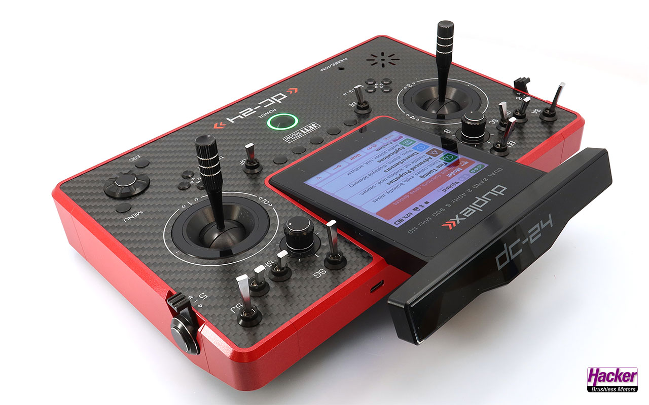 Pultsender DC-24 II – Carbon Line Ruby Multimode (Auslieferzustand Mode 2, Steuermode sehr einfach wechselbar), Senderakku eingebaut, Ladegerät für Senderakku, stabiler Transportkoffer, Senderkreuzgurt