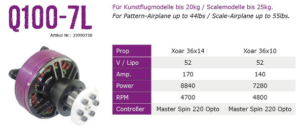 Der Q100-7L ist der leichte Großmodellantrieb im Hacker Motorensegment. Ideal für 3D- / Kunstflugmodelle mit bis zu ~20kg Gewicht. Auch in Scalemodellen bis ~25kg macht der Motor eine gute Figur.