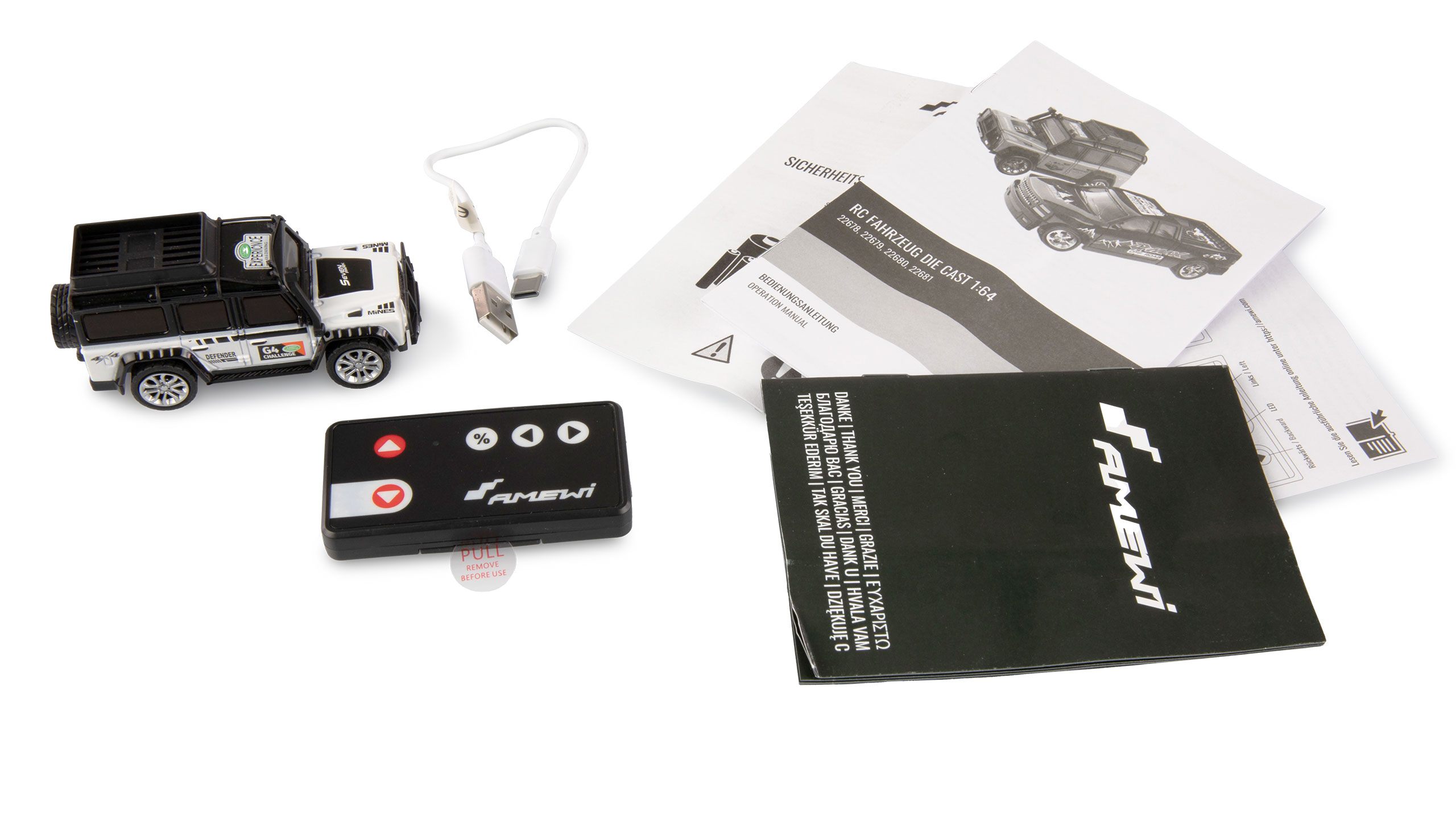 Detailgetreuer Nachbau eines berühmten Offroad-Fahrzeugs im Maßstab 1:64 – die gesamte Karosserie besteht aus Metall (Die Cast) und ist daher besonders strapazierfähig. Das Modell ist mit LED-Beleuchtung vorne und hinten ausgestattet, was coole Lichteffekt auch bei Dunkelheit ermöglicht. Die Reifen bestehen aus Gummi und gewährleisten ein präzises Fahrverhalten, gesteuert über die handliche 2,4GHz Fernsteuerung im Miniformat. Dank seiner Miniatur-Größe kann der RC-Geländewagen überall mithingenommen und auf jedem ebenen Untergrund gefahren werden.