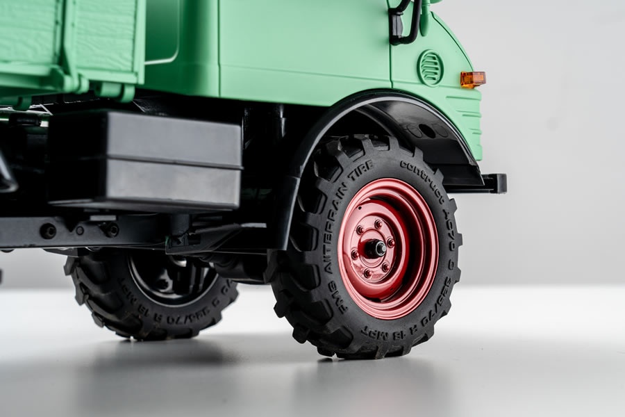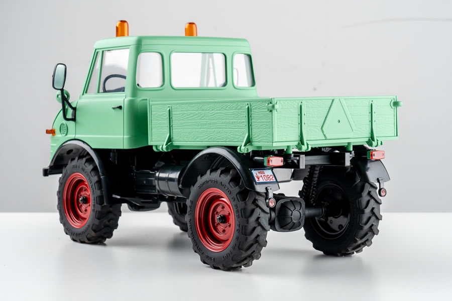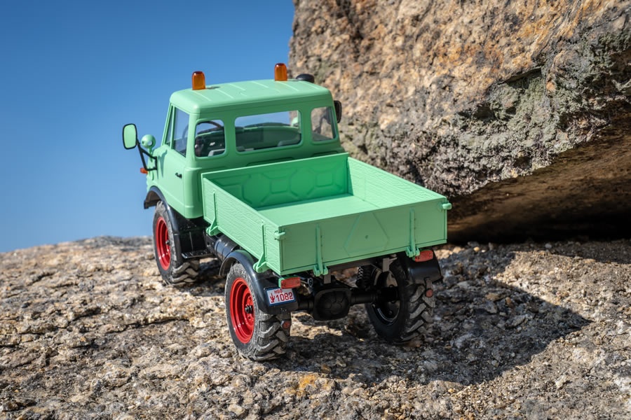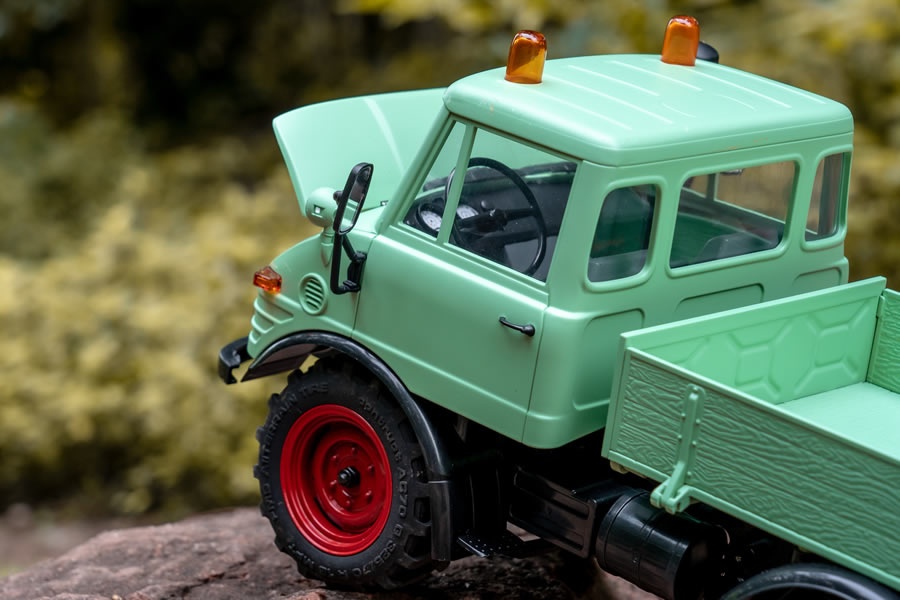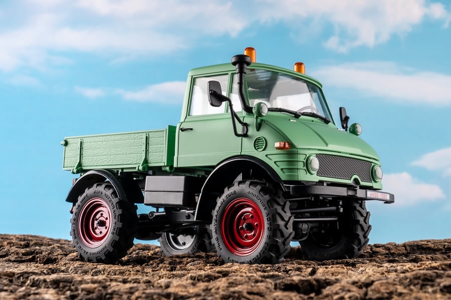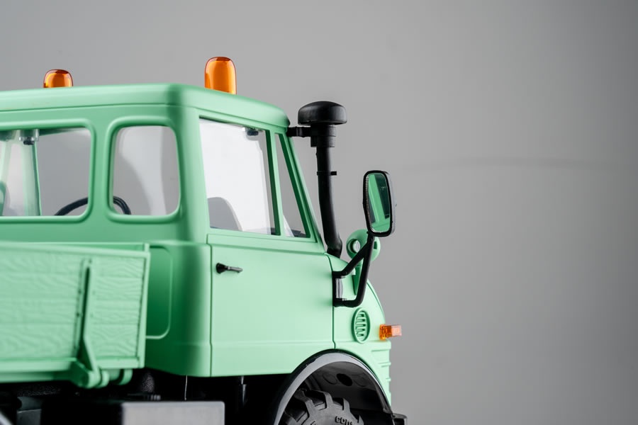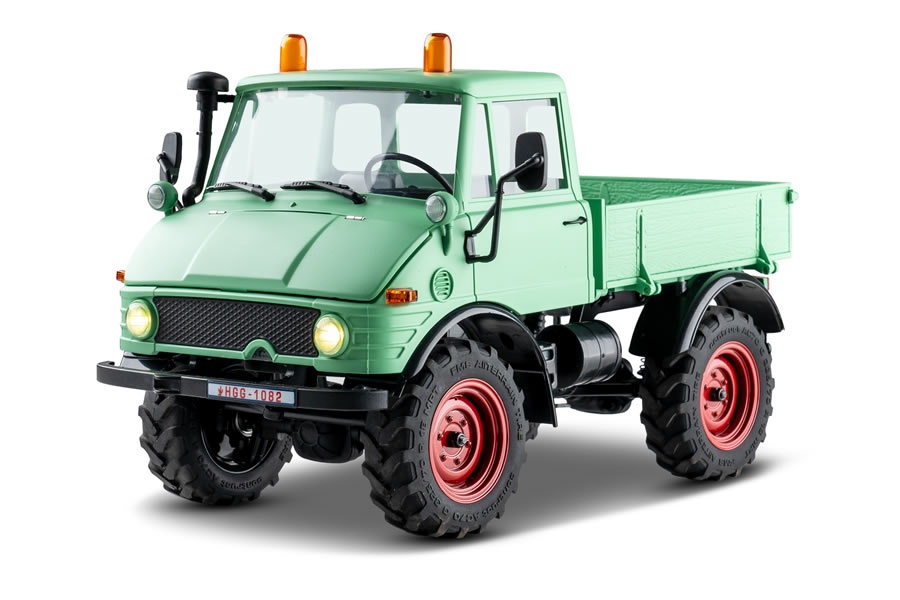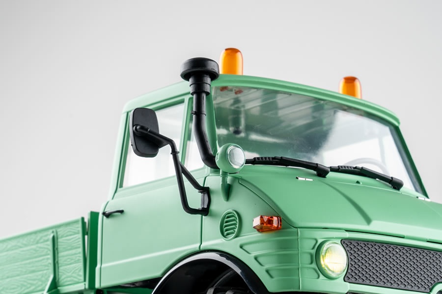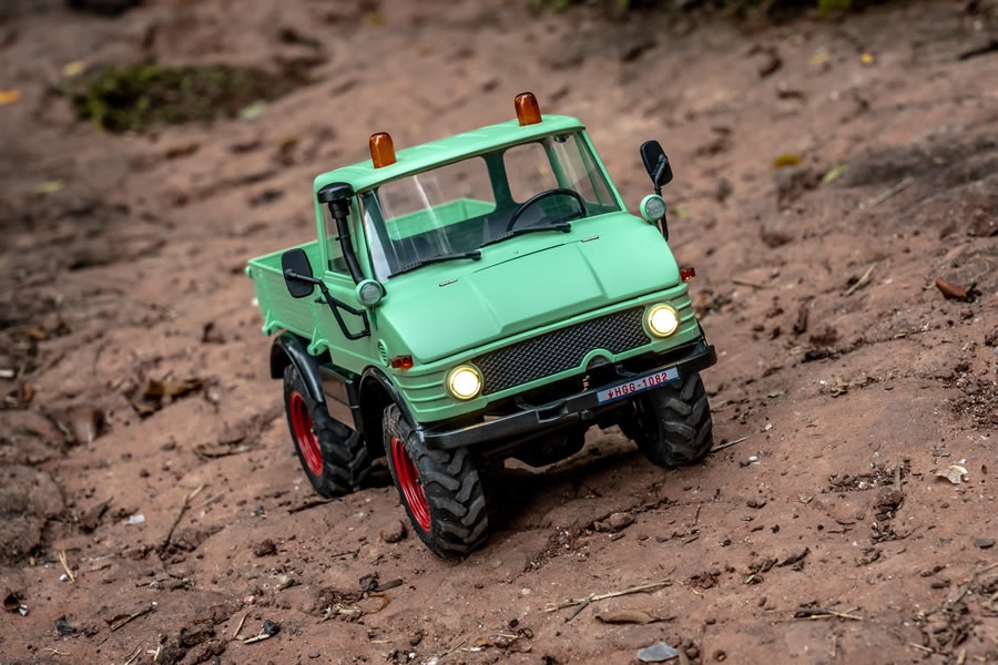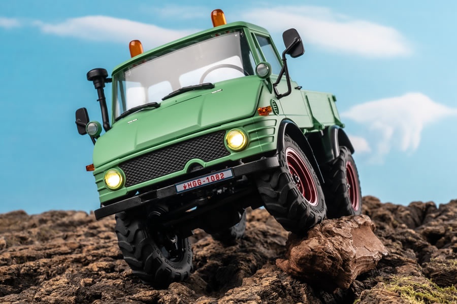 Der Mogrich 1:18 von RocHobby ist als typischer Spezialtransporter aufgebaut, der auch schwierigste Straßenverhältnisse meistert. Das Fahrzeug ist mit verbreiterten Spiegeln und Wathosen, zwei orangefarbenen Warnleuchten auf dem Dach und einem schönen, durch die Fenster sichtbaren Armaturenbrett und detailreichen Cockpit ausgestattet. Die Motorhaube kann für den Batteriewechsel geöffnet werden und dient auch als Stauraum für die Elektronikplatine der Fernsteuerungsanlage.