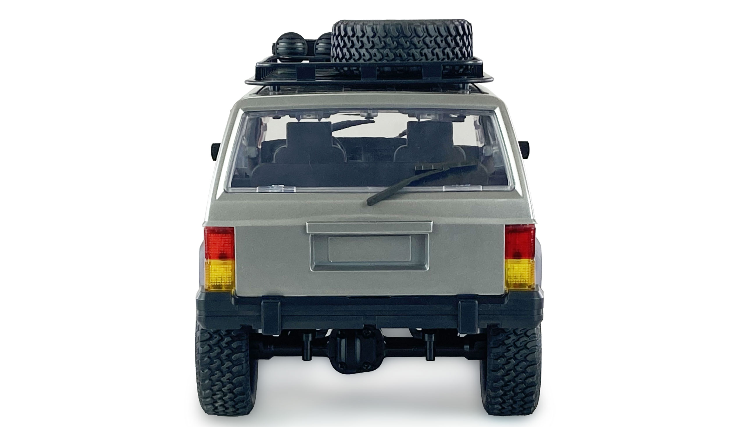 Scale-Geländewagen im Maßstab 1:12 mit vielen Anbauteilen, um so originalgetreu wie möglich aufgebaut zu werden. Vordere Türen, Heckklappe und Motorhaube lassen sich öffnen, letztere dient gleichzeitig als Akkuabdeckung. Das Interieur ist ebenfalls eingebaut und mit Sitzen, Lenkrad, Mittelkonsole sowie Schaltknauf bestens ausgestattet. Dank LED-Beleuchtung, zusätzlich über einen Dachbalken, steht dem Fahrspaß auch bei Dunkelheit nichts im Wege. Für den Geländeeinsatz verfügt das Modell neben Spritzwasserschutz noch über einen starken Motor, 4WD-Antrieb, gesperrte Achsen, 2-Gang-Schaltung, proportionale Steuerung, Dachgepäckträger und eine Drag Brake. Das 2,4GHz Funksystem sorgt dabei für einen sicheren Betrieb auch mehrerer Fahrzeuge parallel.