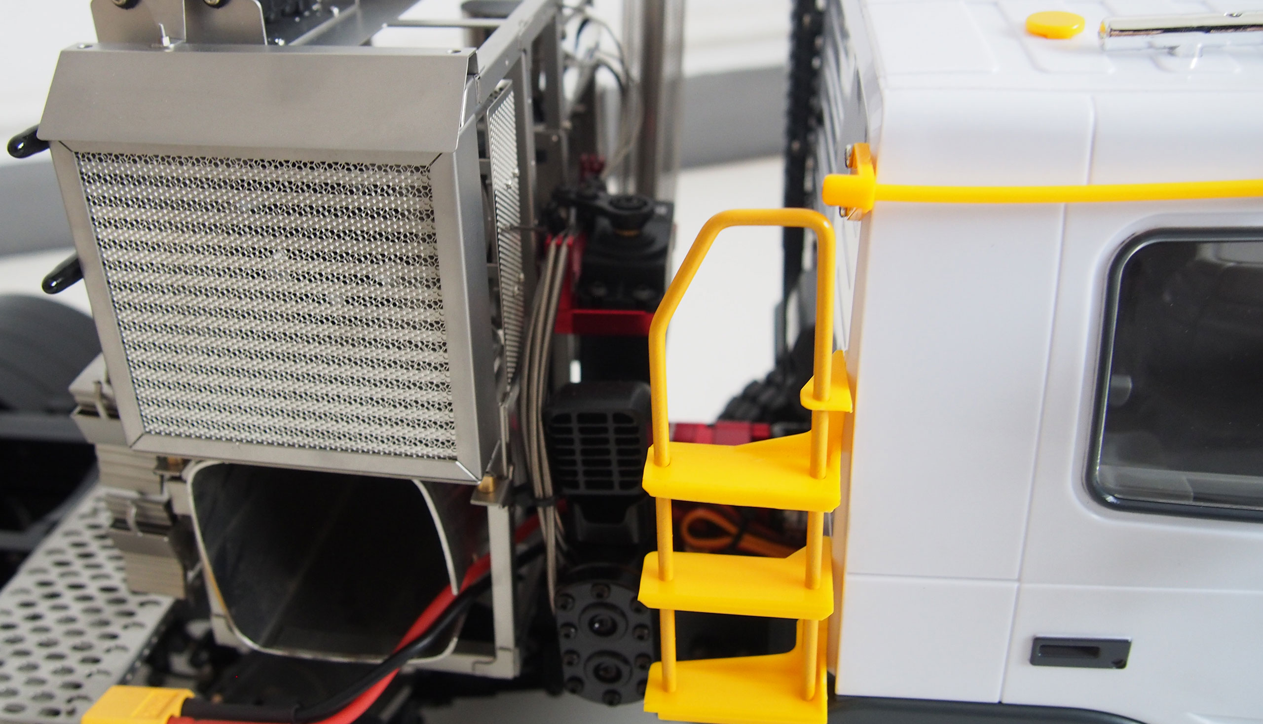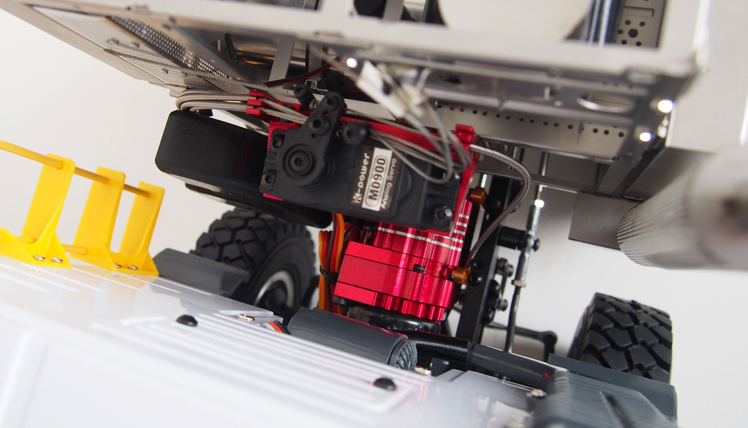 Sehr hochwertiger Scale LKW-Kipper im europäischen Stil (Detaillierte Fahrerkabine aus Kunststoff). Das Chassis, Achsen und Antriebe sind aus hochwertigem Metall hergestellt. Das Modell ist mit einem 2-Gang Getriebe und vom Sender aus schaltbaren Differentialsperren ausgerüstet, welches den Einsatz auch in unwegsamen Geländen problemlos zulässt. Viele Anbauteile wie z.B. der Tank (dieser dient auch als Akkufach) usw. sind ebenfalls aus Aluminium hergestellt.