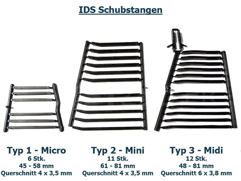- 12 IDS Schubstangen Midi, effektive Längen: 48 / 51 / 54 / 57 / 60 / 63 / 66 / 69 / 72 / 75 / 78 und 81 mm, Querschnitt 6 x 3,8 mm