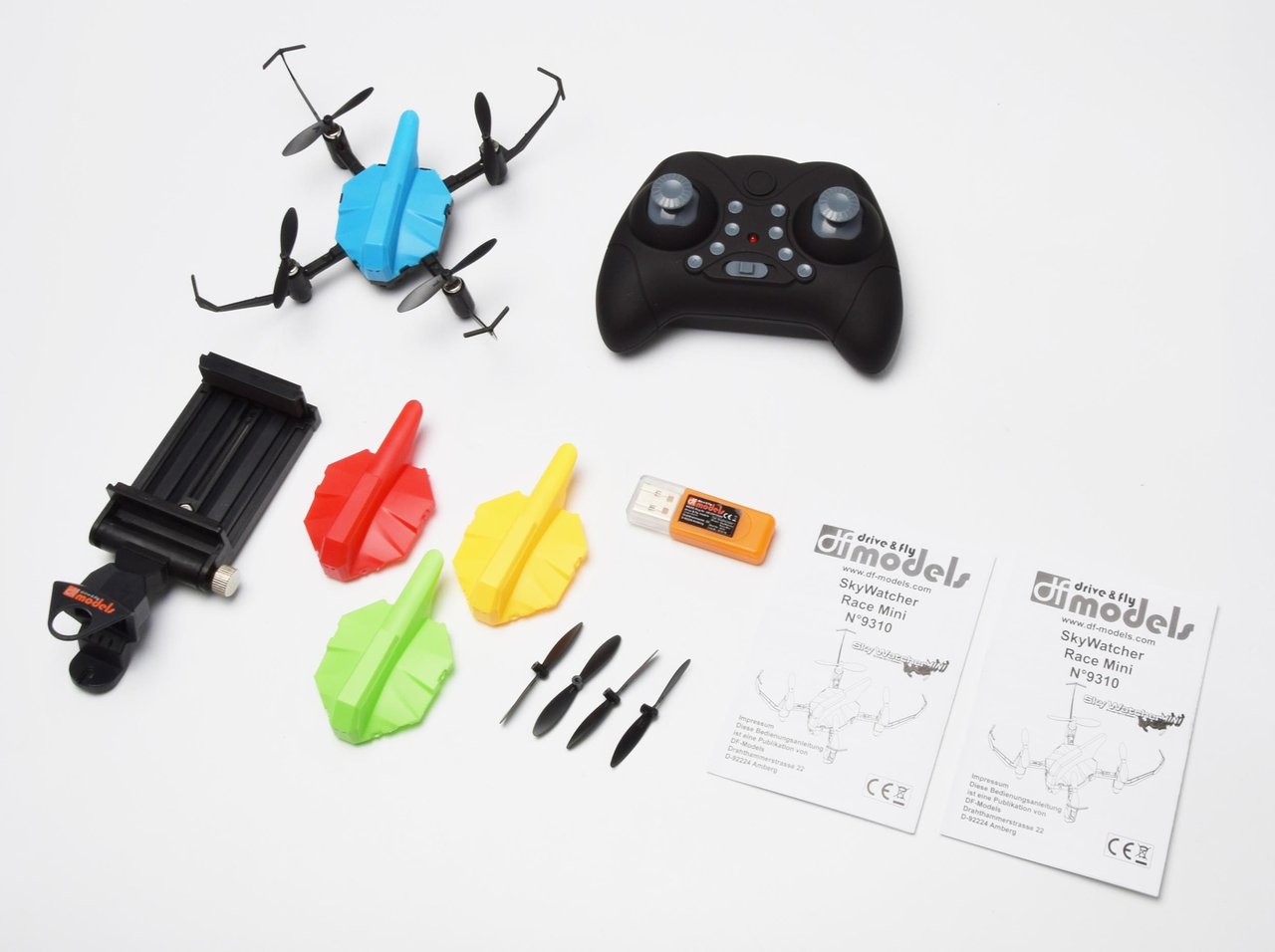 Der SkyWatcher Race Mini verfügt über alle Features wie seine großer Bruder der SkyWatcher Race. Start-Landeautomatik, Höhenstabilisierung, 12-16 Minuten Flugzeit, FPV Kamera mit Bildübertragung auf Ihr Smartphone. Zudem ist der Mini bis zu 10 M/Sek. schnell und somit auch perfekt im Freien zu fliegen! Um Ihr neues Modell optisch individuell gestallten zu können haben wir 3 weitere Wechselbodys beigelegt. Das LiPo Flugakku kann mittels des beiliegendem USB-Lader schnell wieder aufgeladen werden.