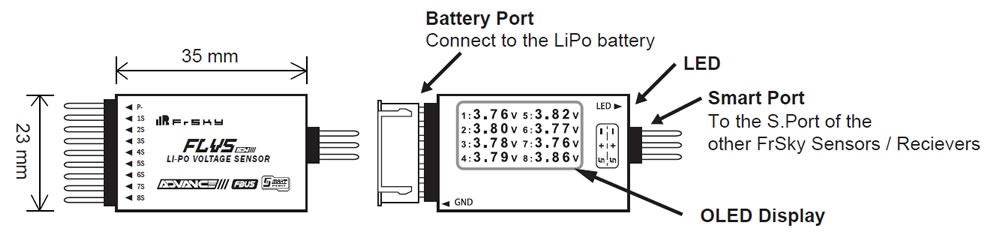 Der FLVS ADV-Spannungssensor kann den Spannungsbereich für 2S- bis 8S-Li-Po-Akkus mit einer Spannungsauflösung von 0,01 V messen und verfügt über ein OLED-Display. Dies ist eine hervorragende Wahl für die genaue Messung von Li-Po-Akkus mit großer Kapazität. Es können auch mehrere dieser Sensoren genutzt werden, da diese galvanisch getrennt sind.