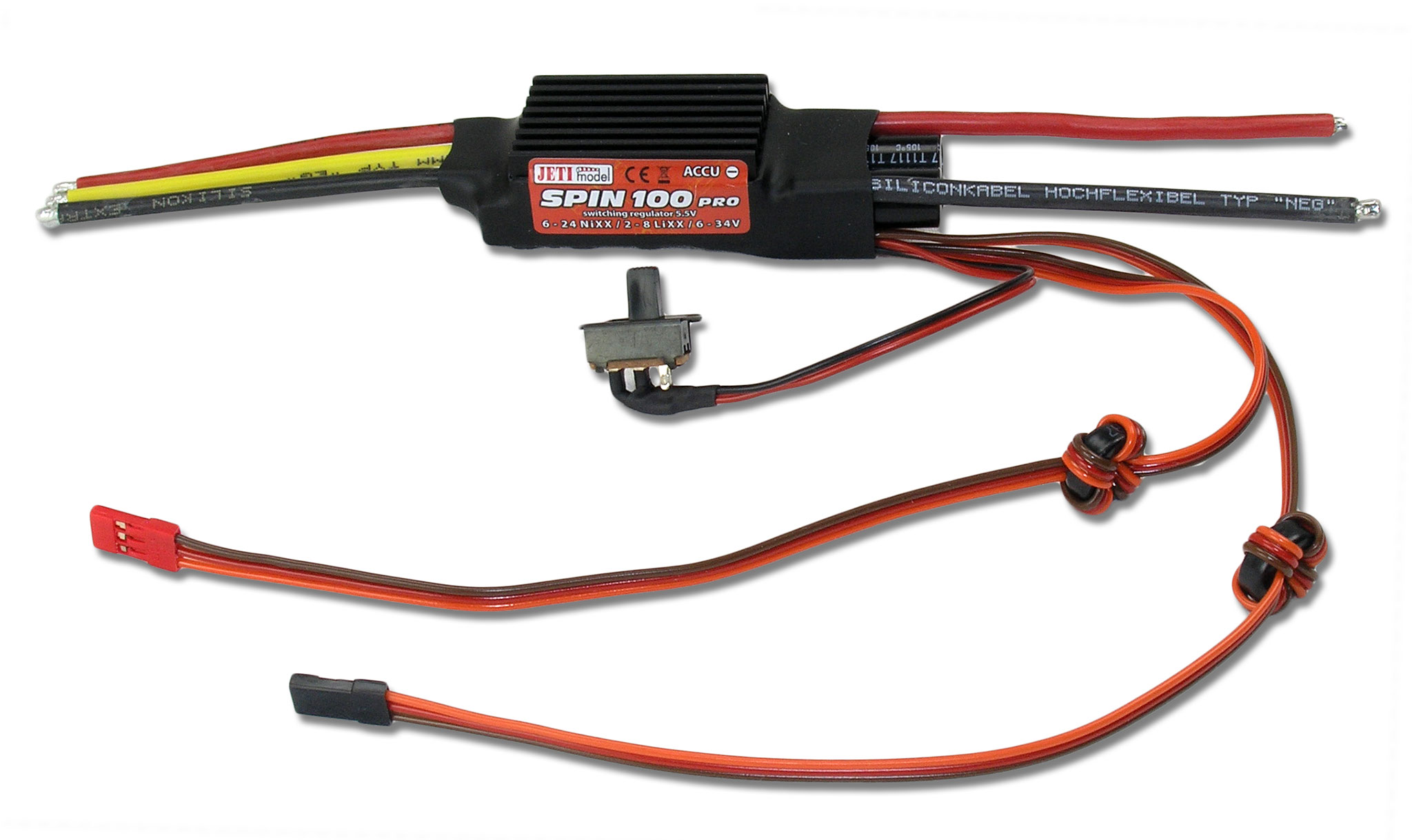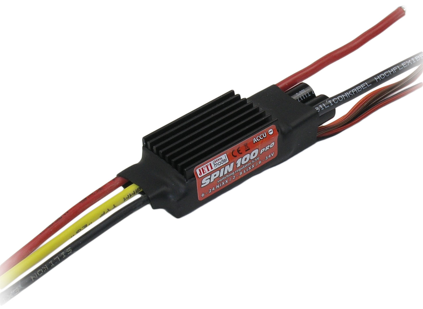Die Controller der Reihe SPIN pro sind Nachfolger der für bürstenlose Motoren bestimmten Drehzahlregler der Serie SPIN. Die Reihe mit dem Attribut PRO bietet entgegen den älteren Verwandten erweiterte Einstellmöglichkeiten, wie z. B. ein automatisches Motor-Timing, eine direkte Einstellung der Abschaltspannung in Volt, ein Tuning des Anlaufverhaltens bei verschiedenen Motortypen und auch die Möglichkeit einer speziellen Modusaktivierung für die Einstellung der Autorotation bei Hubschraubern. Das Leistungsspektrum der Jeti Spin pro controller deckt den gleichen Bereich wie ihre Vorgänger, die Jeti SPIN, d. h. von 11A bis 300A ab.