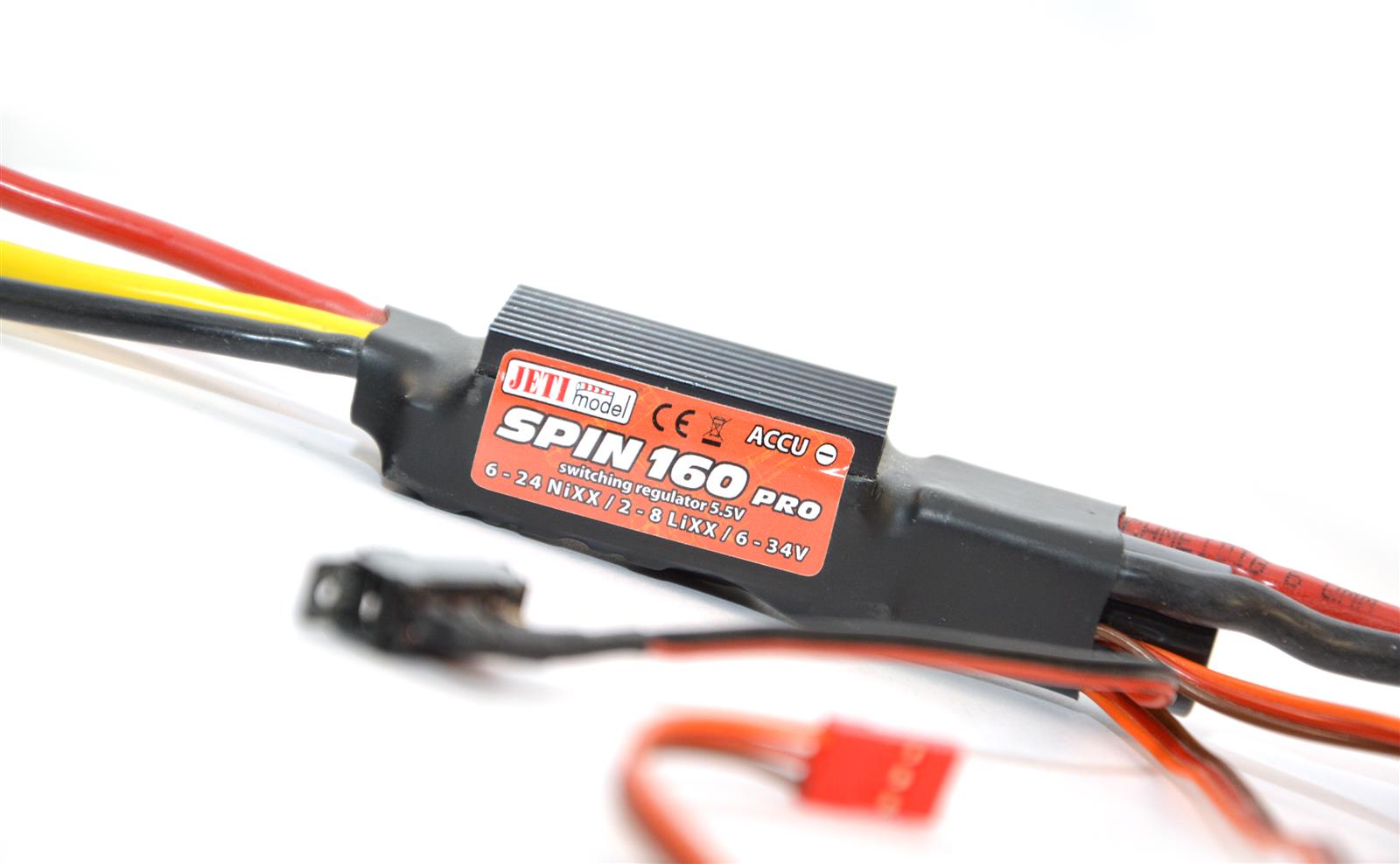 Die Controller der Reihe SPIN pro sind Nachfolger der für bürstenlose Motoren bestimmten Drehzahlregler der Serie SPIN. Die Reihe mit dem Attribut PRO bietet entgegen den älteren Verwandten erweiterte Einstellmöglichkeiten, wie z. B. ein automatisches Motor-Timing, eine direkte Einstellung der Abschaltspannung in Volt, ein Tuning des Anlaufverhaltens bei verschiedenen Motortypen und auch die Möglichkeit einer speziellen Modusaktivierung für die Einstellung der Autorotation bei Hubschraubern. Das Leistungsspektrum der Jeti Spin pro controller deckt den gleichen Bereich wie ihre Vorgänger, die Jeti SPIN, d. h. von 11A bis 300A ab.