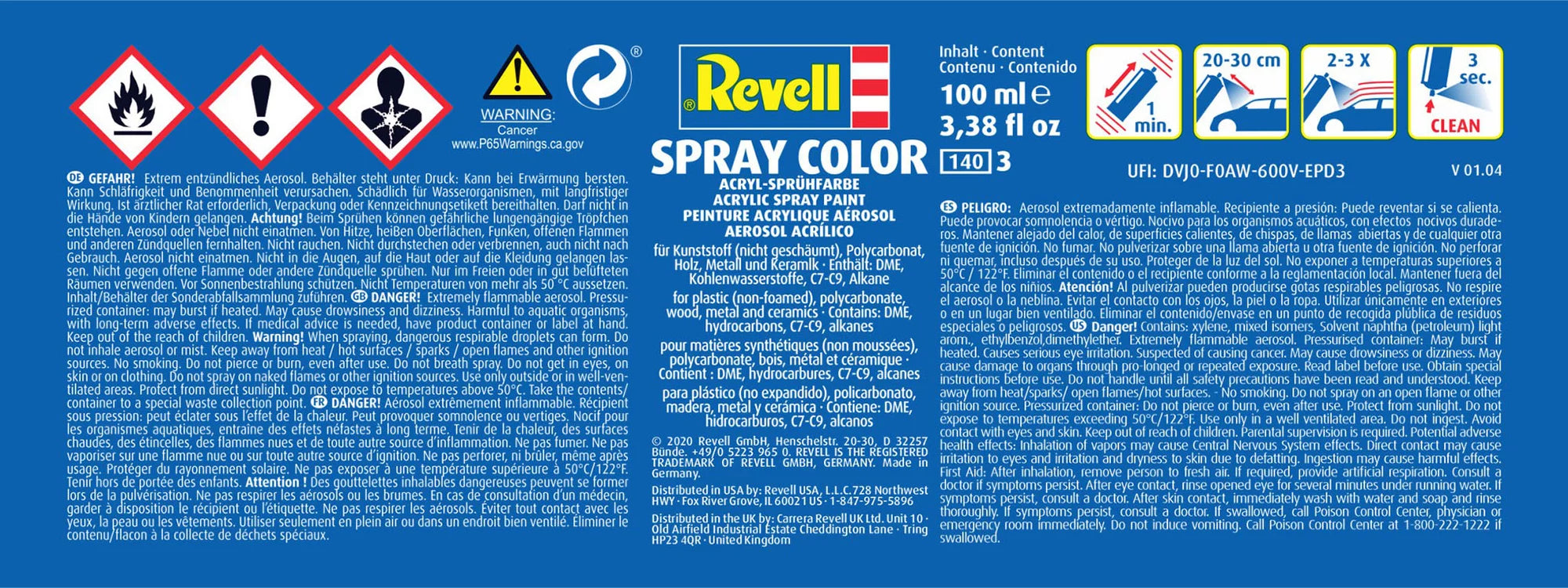 Revell Spray Color sind Acryl-Sprühfarben, die sehr schnell trocknen und eine hohe Deckkraft sowie eine hohe Kratzfestigkeit besitzen. Aufgrund ihrer besonderen Zusammensetzung lassen sich mit Spray Color auch Polycarbonat-Karosserien von RC-Cars lackieren.