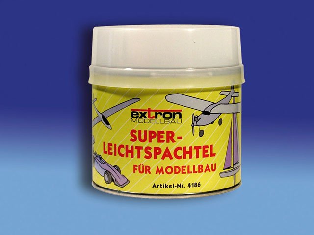 Super-Leichtspachtel ist zum schnellen Ausspachteln auch größerer Unebenheiten an Flugmodellen ideal. Er besteht aus zwei Komponenten, ist auf Polyesterbasis aufgebaut, trocknet rasch und läßt sich problemlos schleifen und lackieren. Das spezifische Gewicht beträgt nur etwa 50% des herkömmlichen Polyesterspachtels.