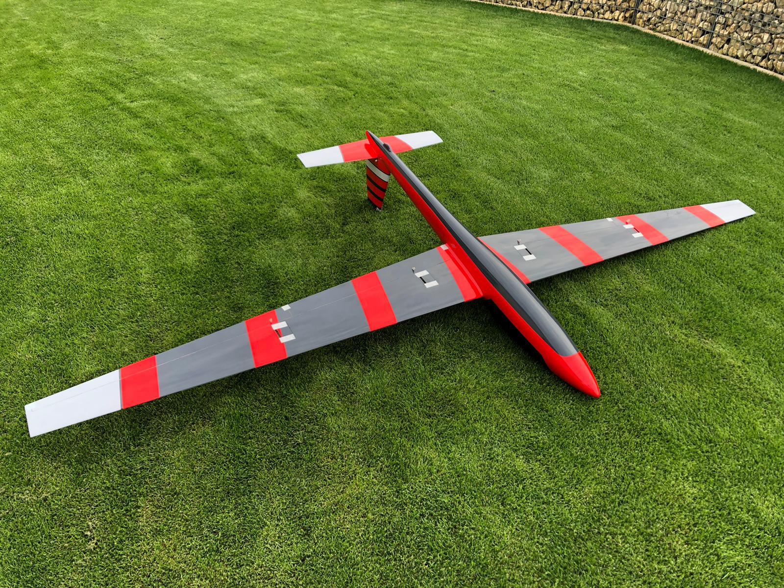 - hochglänzend lackierter GFK/CFK Rumpf mit fertiger Höhenruderverschraubung und montiertem Seitenruder