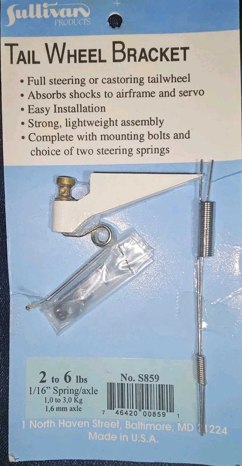 Spornradhalterung 40 SULLIVAN S859 Tail wheel bracket 40 Steerable Tailwheel Bracket. Springs absorb both ground bumps and steering shocks to protect the model and the servos. Easy to install with just two bolts (tailwheel not included).- Model weight: 2 to 6 lbs (1-3 Kg)