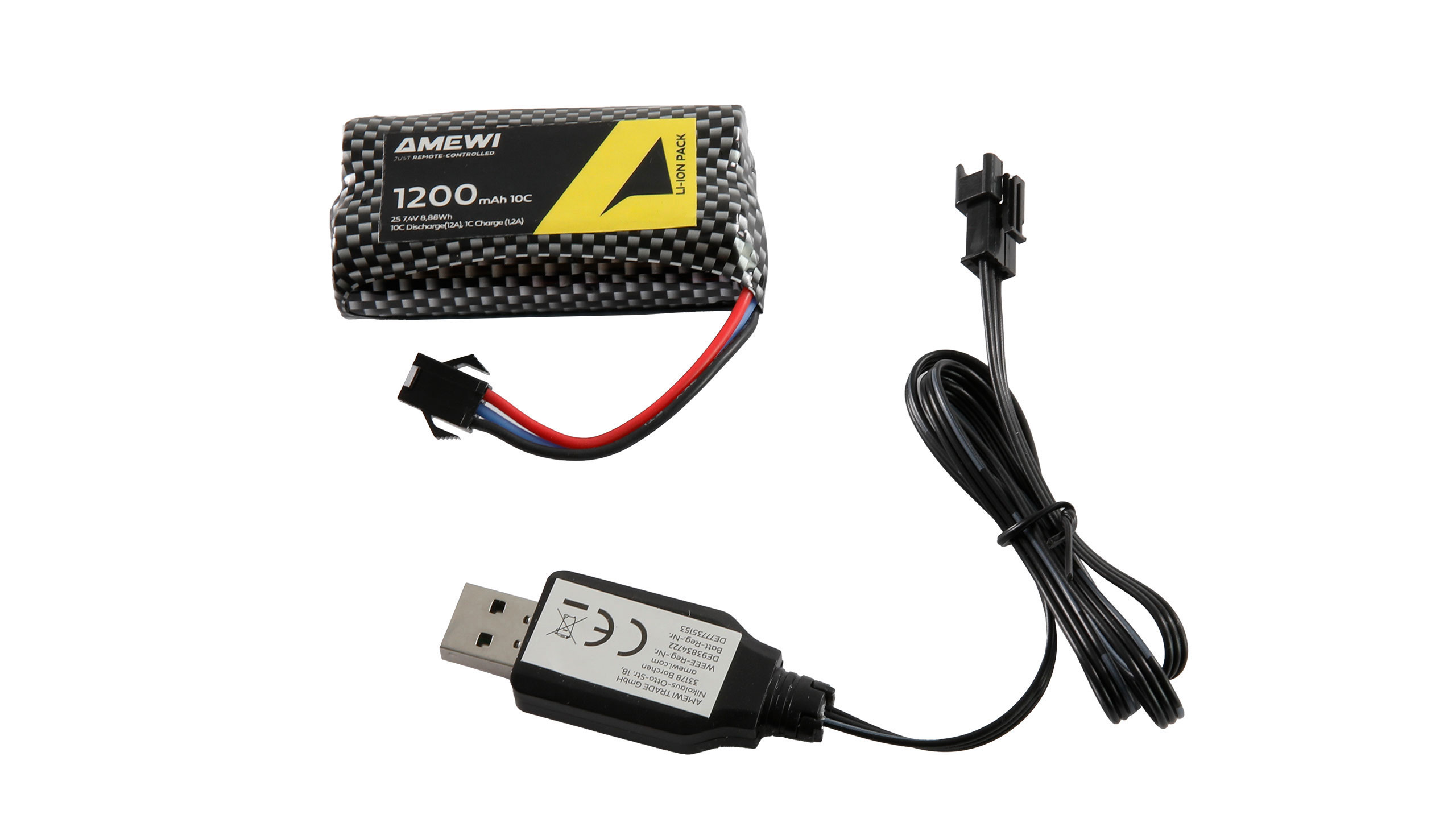 Technische Daten: Maßstab: 1:12 Länge: 380mm Breite: 145mm Höhe: 150mm Gewicht: 885g inkl. Akku Hauptmaterial: Kunststoff Radstand: 215mm Spurbreite vorne: 130mm Spurbreite hinten: 130mm Bodenfreiheit: 20mm Vorderräder: Außendurchmesser/Breite 62/22mm Hinterräder: Außendurchmesser/Breite 62/22mm Felgendurchmesser: 37mm Getriebe: Kunststoff Dämpfer vorne: 55mm Dämpfer hinten: 45mm Bremse: Elektronisch Regler: Brushed Motor: Brushed Antriebssystem: Kardan Lenkservo: Mini Digital Akkufach Abmessungen: 70x40x20mm Akku: Li-Ion 2S 7,4V 1200mAh15C Rundzellen, HBX-Stecker 3-Polig, 70x40x18mm, 75g Fahrzeit: bis zu 30 Minuten Höchstgeschwindigkeit: ca. 15km/h Fernsteuerung: 4 Kanäle, 2,4GHz Reichweite: 80-100 Meter Ladegerät: USB Ladezeit: ca. 120-180 Minuten