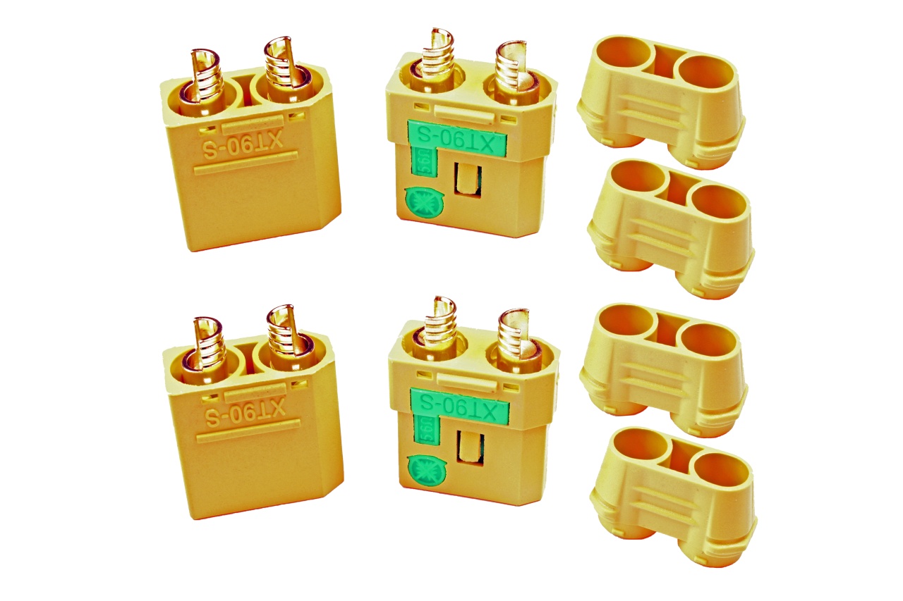 Das XT-90S bietet wie das XT-90 alle Vorteile des XT-60 – nun aber verbunden mit höherer Lastfestigkeit, größeren Gehäusen und für gute Kühlung freiliegenden Kontaktelementen. Ausserdem bietet das XT-90S den Anti-Blitz-Schutz.
