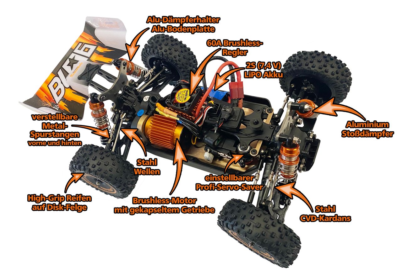 BL06 … der „große Bruder“ des Z-06 Buggy mit BRUSHLESS-Power. Der BL06 Brushless Buggy ist wie sein kleiner Bruder (Z-06) mit allen nur erdenklichen Tuningteilen „out oft the box“ ausgestattet. Aluminium Öldruckstoßdämpfer, Metall-Antriebswellen, Metall-CVD Kardans vorne, Aluminium Querlenkerhalterungen und Dämpferbrücken, Metall Rechts-/Links-Gewindestangen, Spezial-Servo-Saver, gekapseltes Getriebe sowie ein Metall-Chassis lassen keine Tuning-Wünsche mehr offen! Der BL06 ist ein 4WD Buggy mit 4300KV brushless Motor, der mit einem 7,4 Volt LiPo-Akku angefeuert wird. Die neuen Grip Reifen auf Disk-Felgen bringen die Power auf die Straße und in das Gelände.